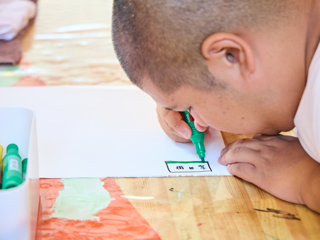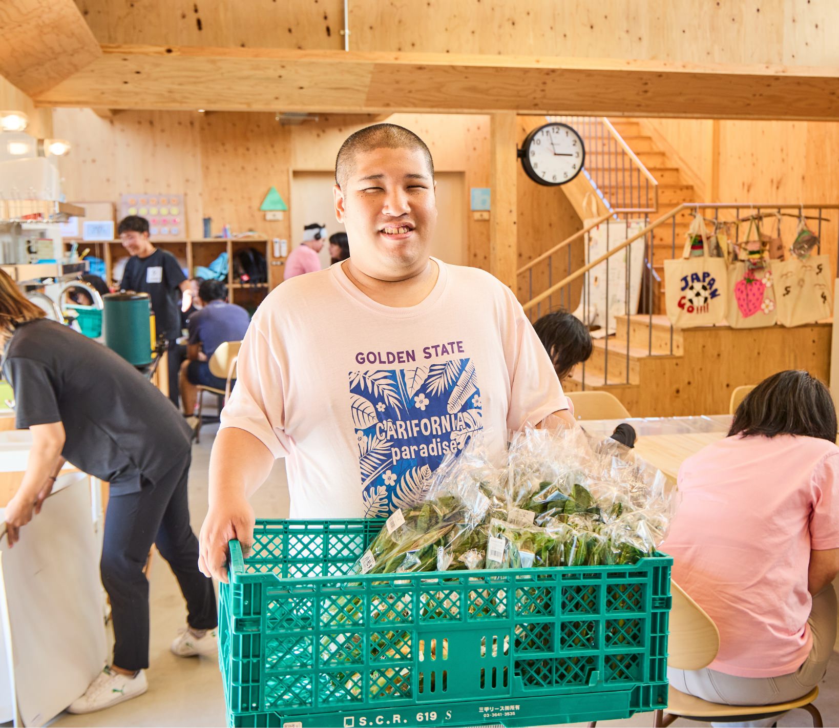好きなこと、気になったこと、得意なことになんでもチャレンジ!畑で野菜を育てたり、絵を描いたり……。できることを見つけ、楽しく挑戦しながら、販売・展示を通して地域の人との接点をつくり、新しい「価値」を生み出していく場所です。